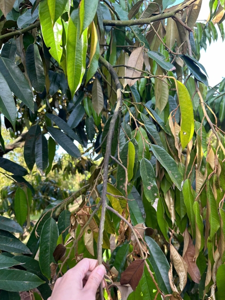 Rầy nhảy chích hút khiến lá sầu riêng khô héo, rụng hàng loạt