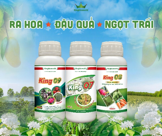 King 07: Lân hữu cơ sinh học hàm lượng cao cùng dinh dưỡng đặc hiệu như Axit humic, vi lượng… kích thích ra hoa đồng loạt, dưỡng hoa, tăng đậu trái. Thích hợp để xử lý hoa nghịch vụ, sớm vụ hoặc trễ vụ theo ý muốn.